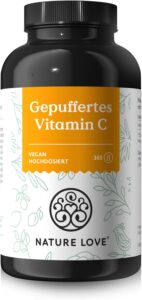 Die gepufferten Vitamin-C-Kapseln von Nature Love bieten 1000 mg pH-neutrales Vitamin C (Calciumascorbat) pro Tag.